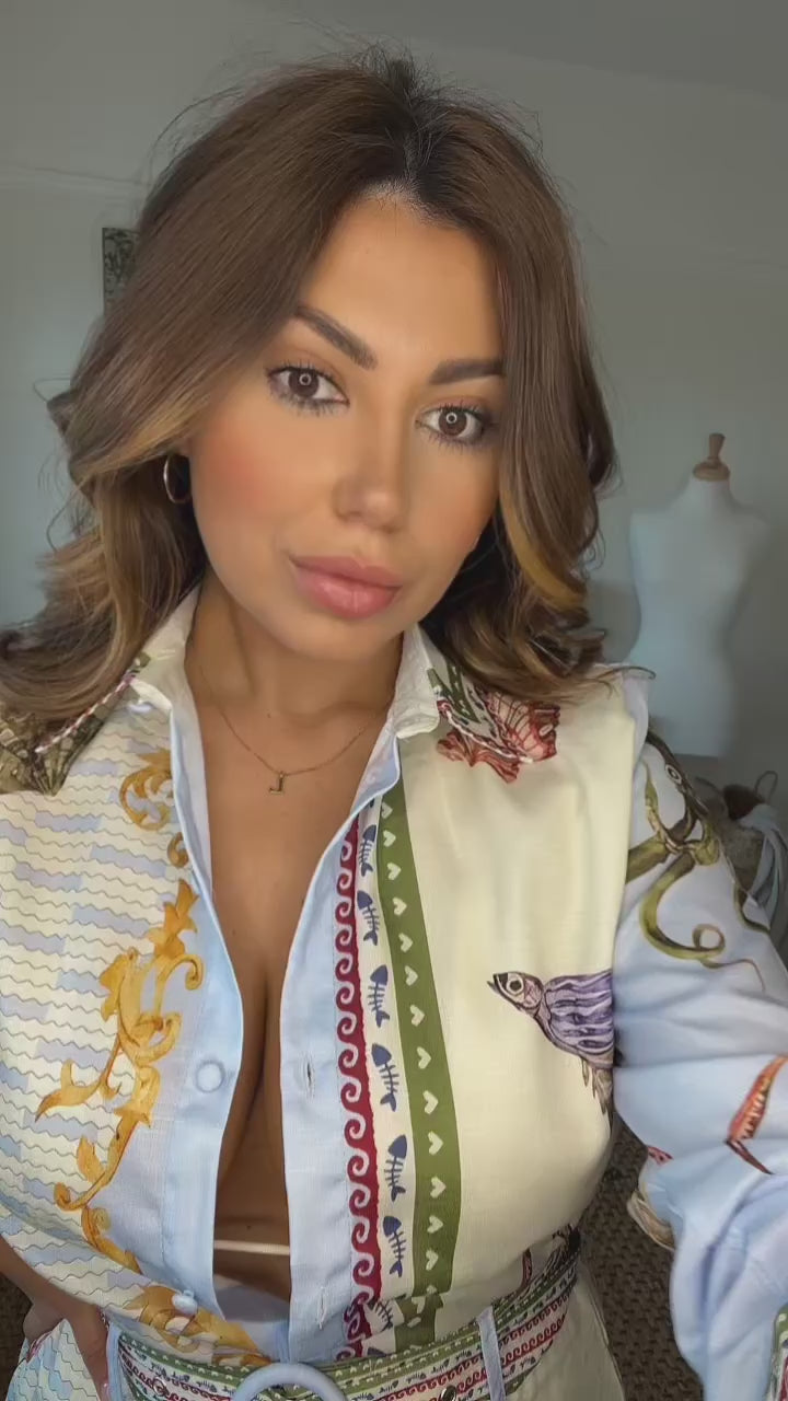 Introducing the MALLORCA Co-Ord, a versatile and stylish addition to your holiday wardrobe. This set includes a belt and can be worn together or separately, offering endless options for your outfits. With its sophisticated design, it will fit perfectly up to a UK size 14. Upgrade your holiday style with this colourful and classy co-ord.